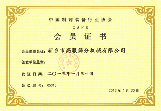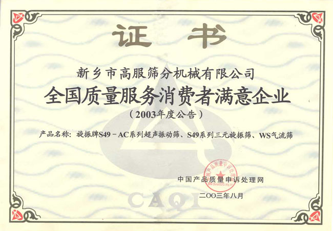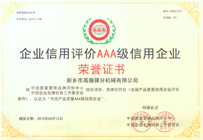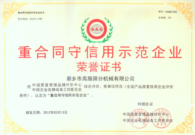 新鄉(xiāng)高服篩分機(jī)械有限公司榮譽(yù)證書